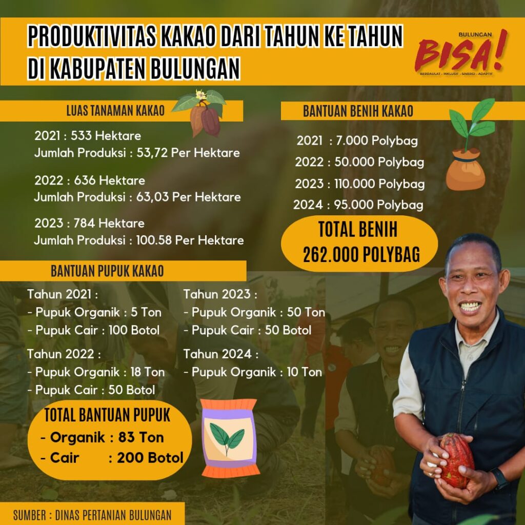 Dari data Dinas Pertanian Kabupaten Bulungan, angka luas lahan perkebunan kakao tahun 2021 Bulungan 533 hektar dengan angka produksi per tahun mencapai 53,72 ton. Tahun 2022 luas tanam kakao 636 hektar dengan produksi 63,03 ton, 2023 luas tanam 784 hektar, denga angka produksi 100,58 ton.