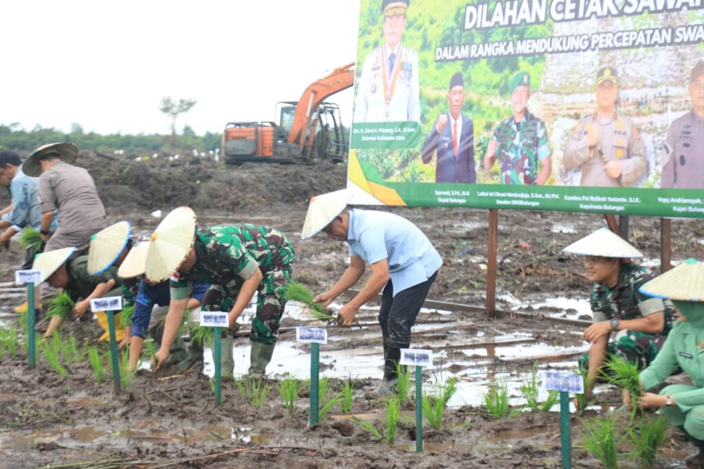 SALIMBATU,TANJUNGNEWS.COM– Bupati Bulungan, Syarwani, S.Pd., M.Si., mengikuti kegiatan tanam padi perdana di Lahan Cetak Sawah Rakyat (CSR) seluas 98 hektar berlokasi di Desa Salimbatu, pada