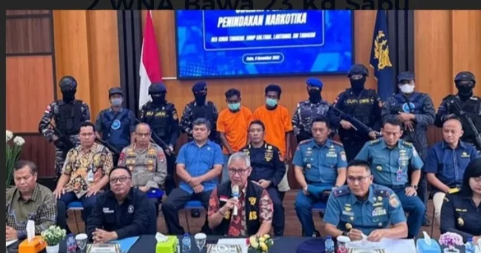 KONFERENSI PERS: Petugas gabungan saat melakuman konferensi pers terhadap kurir narkoba jaringan internasional dengan barang bukti sabu seberat 23 kilogram. Foto : Istimewa