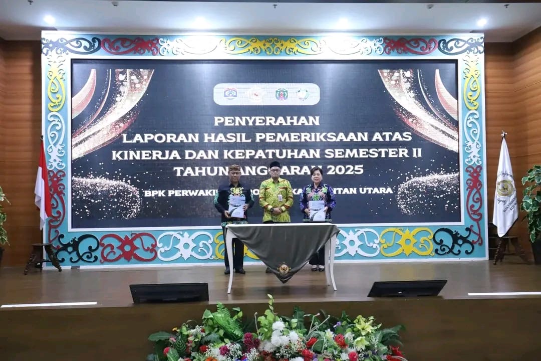 TARAKAN, TANJUNGNEWS.COM– Wakil Bupati Malinau Jakaria bersama Ketua DPRD Kabupaten Malinau menghadiri penyerahan Laporan Hasil Pemeriksaan (LHP) Kinerja dan Kepatuhan Semester II Tahun 2025 oleh Badan Pemeriksa Keuangan (BPK) Perwakilan Provinsi Kalimantan Utara, Rabu (7/1/2026).